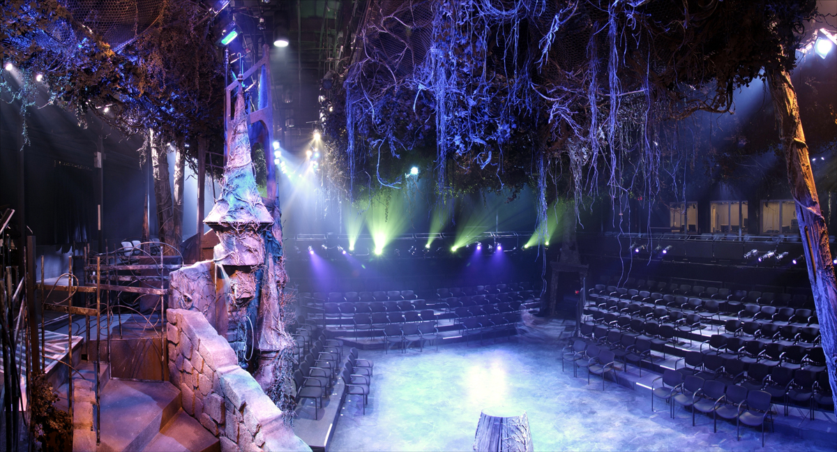 Signature Theatre’s Arlington venue includes a two-stage performance facility, highlighted by the 294-seat Diamond Theatre, whose shaped plywood wall panels fade to black as they approach the stage. The building features a high-ceilinged lobby with floor-to-ceiling windows, café seating, and a dedicated coat-check area, as well as a full-service catering kitchen that supports private events and special performances.